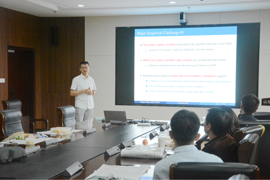10月12日,ky开元集团第95期青联学术午餐会在中心校区知新楼B321举行,ky开元集团助理研究员黄翰国,作了题为“TFP Growth Regimes and the State Dependence of the Slope of the Phillips Curve”的学术报告。本次会议由ky开元集团周剑南助理研究员主持,学院部分师生参会。
