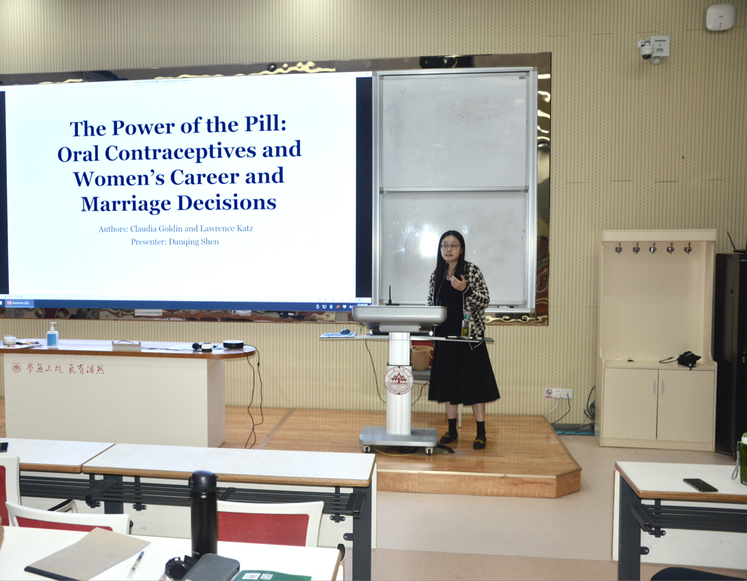 沈丹青助理研究员讲解了戈尔丁的论文“ThePowerofthePill:OralContraceptivesandWomen’sCareerandMarriageDecisions”。报告指出,事业女性选择生育的机会成本更高,生育不仅影响女性的事业投资,也会影响女性的教育选择,口服避孕药的合法使用通过劳动市场和婚姻市场两种机制使女性更自由地进行事业和婚姻决策,女性职业选择也由此发生了较大变化。论文利用双重差分法构建计量模型,对美国不同地区口服避孕药的普及时间及女性出生年份进行双重差分,证明了口服避孕药的普及有效降低了女性早婚比例,提高了婚姻的稳定程度,并使得女性更多地选择律师、医生等专业性更强的职业。戈尔丁对未来性别工资差异整体持乐观态度,认为远程办公等让时间更加灵活的工作方式使女性可以尽量减小自己的劣势,逐渐缩小男女工资差距;但对于那些显著要求特异性的行业,家庭的负担始终存在,所以短期内要实现男女工作者比例相同或薪酬水平相同仍较为困难,有待于科技进一步发展。