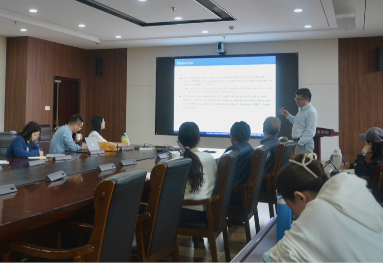 第二次世界大战后,中东和北非部分国家为所有儿童提供了免费的义务基础教育机会,受社会传统伦理观念的制约,在该地区建立的学校大多数是男校,女子学校或男女混合学校的缺乏,限制了女性教育的发展。报告介绍了在约旦发生的显著的人口结构转变,并将约旦扩大女性进入女子学校或男女混合学校的机会作为自然实验以调查进入学校学习对女性教育和生育率的影响。结果发现,如果妇女在小学低年级期间或之前能在其出生地所在的分区进入一所性别比例适当的学校,那么她的受教育年限会就会增加3.0-3.4年,生育率会降低1.0-1.4例。利用进入与性别相适应的学校的机会作为女性教育程度的工具,工具变量估计结果表明,多一年的学校教育会使总生育率降低0.3-0.4。最后,报告还介绍了教育代际传递的现象,即母亲受教育年数的增加提高了子女增加受教育年限的可能性。报告还指出,没有可靠证据表明约旦女性受教育程度的提高造成了劳动力市场参与度的提高,排除了其作为生育率降低机制的可能性。报告过程中,张宏亮与参会人员就数据获取、模型构造、机理分析等方面的问题进行了充分讨论。