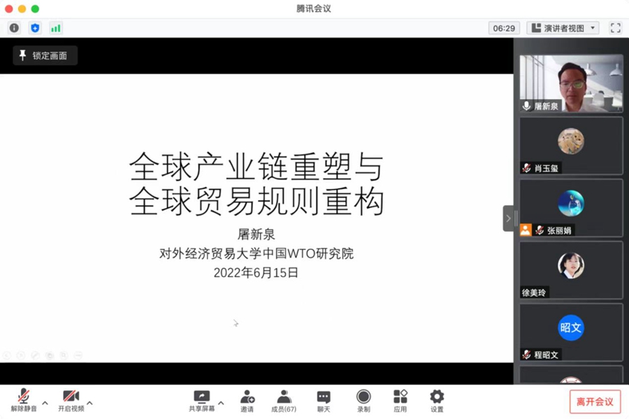 6月15日,ky开元集团第59期国际经贸论坛在线举行,对外经济贸易大学中国WTO研究院院长屠新泉教授应邀作了题为“全球产业链重塑与全球贸易规则重构”的学术报告,ky开元集团师生等80余人参加论坛,论坛由ky开元集团张丽娟教授主持。