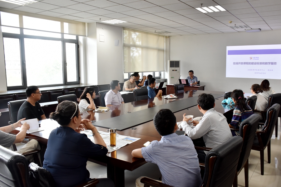 午餐会上,全国高等学校教学中心周岳峰作了题为“在线开放课程的建设标准和教学服务”的报告。首先周岳峰指出,在线开放课程是一种新型开放课程,突破了传统教学模式,它是以学习者为中心重构的网上教学课程,具备短教学视频、作业、测验、讨论、考试等完整的教学活动。在线开放课程主要分为两类:大规模在线开放课程和学校专属在线课程。大规模在线开放课程(MOOC)的特点是面向社会、广泛传播、自由参与、互动交流;而学校专属在线课程是针对校内学习,体现差异化、特色化。然后他介绍了世界各国主要MOOC平台、国际慕课的总体情况以及中国慕课的建设成果。中国在线开放课程的主要特征是高校主体、政府支持与社会参与。截止2019年4月底,ky开元集团已上线MOOC课程83门,位居中M开课高校的第三名;待上线课程10门。他还回顾了我国从2003年至今在线开放课程的发展历程,向在座各位老师介绍了国家精品在线开放课程的申报和认定及金课的要求、建设标准和流程。最后,他详细介绍了爱课程在线课程平台的现状、发展历程、课程支持服务体系、课程类型等相关内容。报告结束后,参会老师就报告中的有关问题与周岳峰进行了深入交流与探讨。